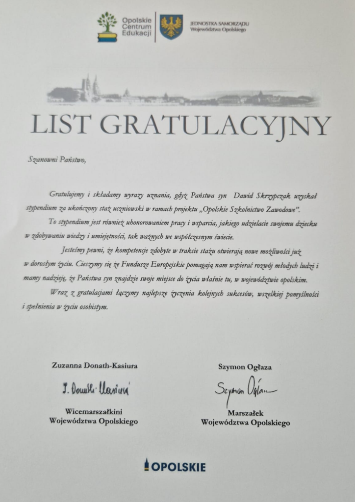 W ramach projektu „Opolskie Szkolnictwo Zawodowe”, współfinansowanego z Europejskiego Funduszu Społecznego Plus w programie Fundusze Europejskie dla Opolskiego 2021–2027, aż 72 uczniów naszej szkoły otrzymało wsparcie w postaci płatnych staży uczniowskich!