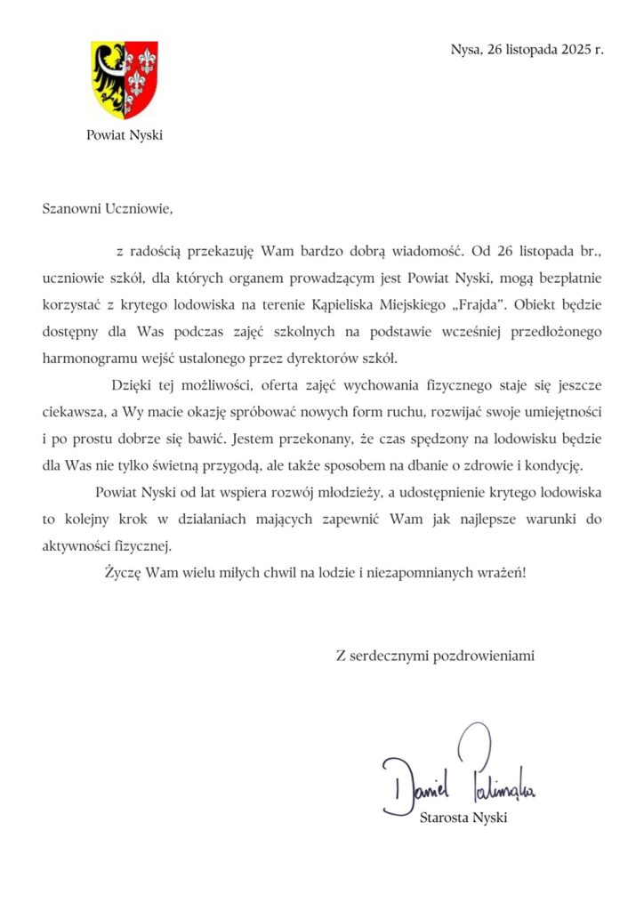 Informujemy, że od 26 listopada br. uczniowie szkół, dla których organem prowadzącym jest Powiat Nyski, mogą bezpłatnie korzystać z krytego lodowiska znajdującego się na terenie Kąpieliska Miejskiego „Frajda”.