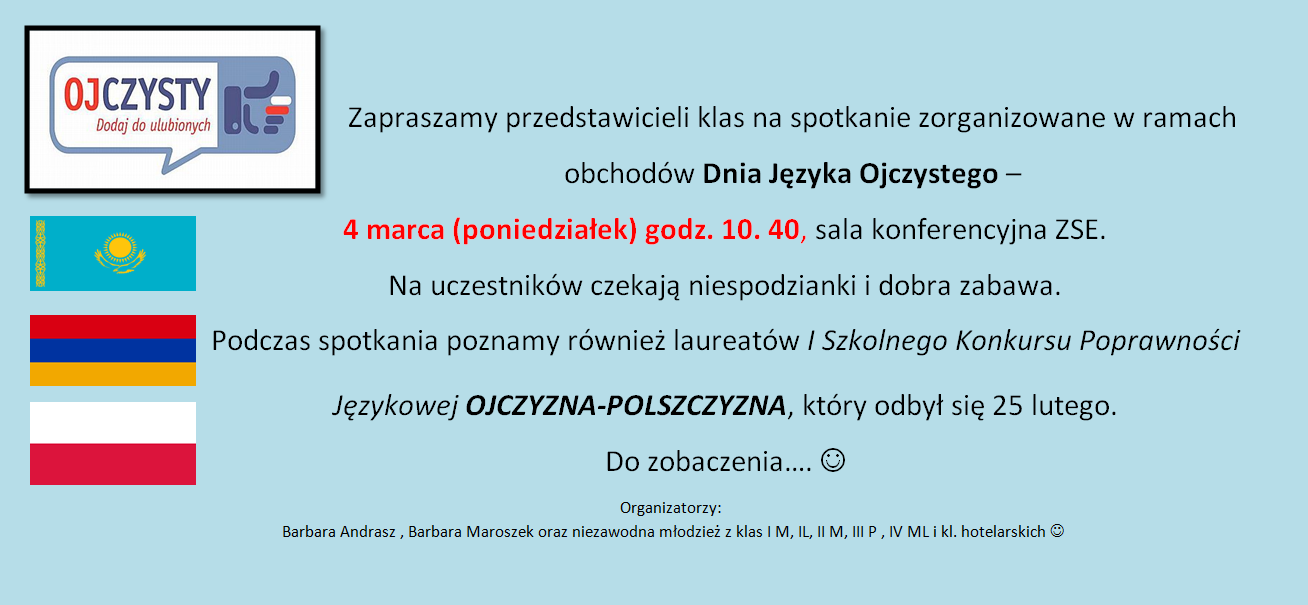 Znamy laureatów I Szkolnego Konkursu Poprawności Językowej OJCZYZNA POLSZCZYZNA zorganizowanego w ramach obchodów Dnia Języka Ojczystego : I miejsce: Justyna Jakisz II M oraz Sonia Kumala IV H II miejsce : Emilia Stachowcz I M III miejsce: Natalia Mrozek II P1 wyróżnienie : Adelya Sissenova I M Wszystkim uczestnikom serdecznie gratulujemy . II edycja konkursu już za […]